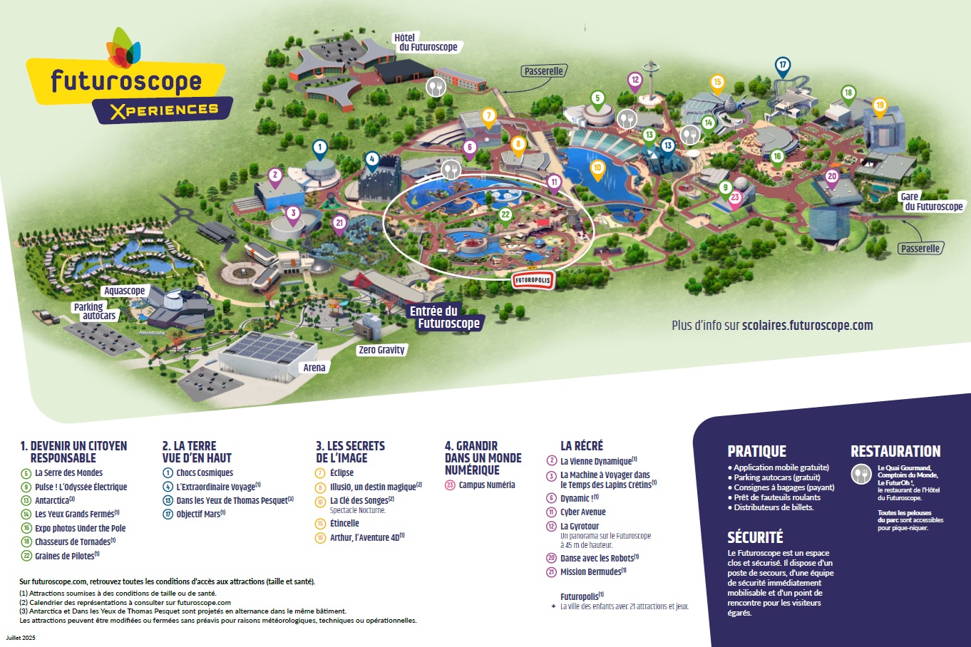 Le Futuroscope n’est pas organisé en zones thématiques strictes mais en espaces : le cœur du parc avec les grandes attractions immersives, Futuropolis (village dédié aux 3-12 ans), l’Aquascope (parc aquatique séparé) et les nouvelles zones 2026. Le plan indique clairement chaque pavillon et son attraction principale.